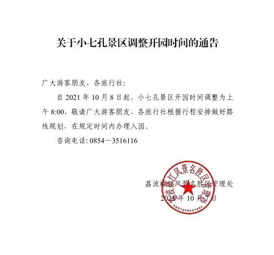 关于小七孔景区调整开园时间的通告