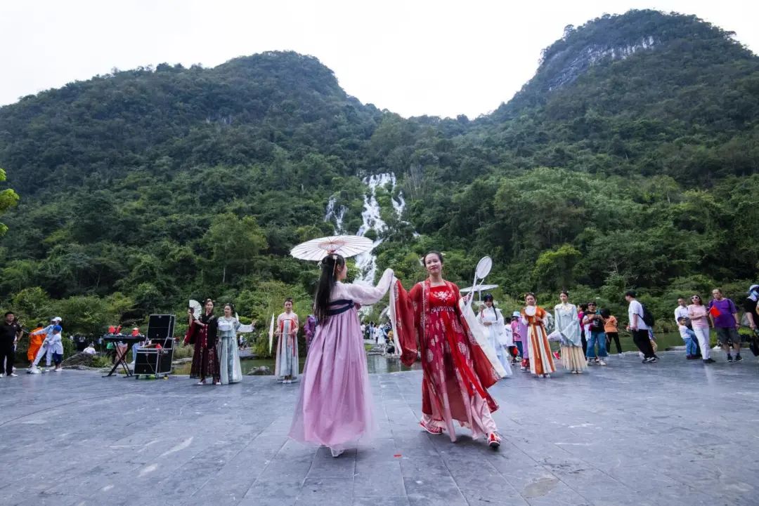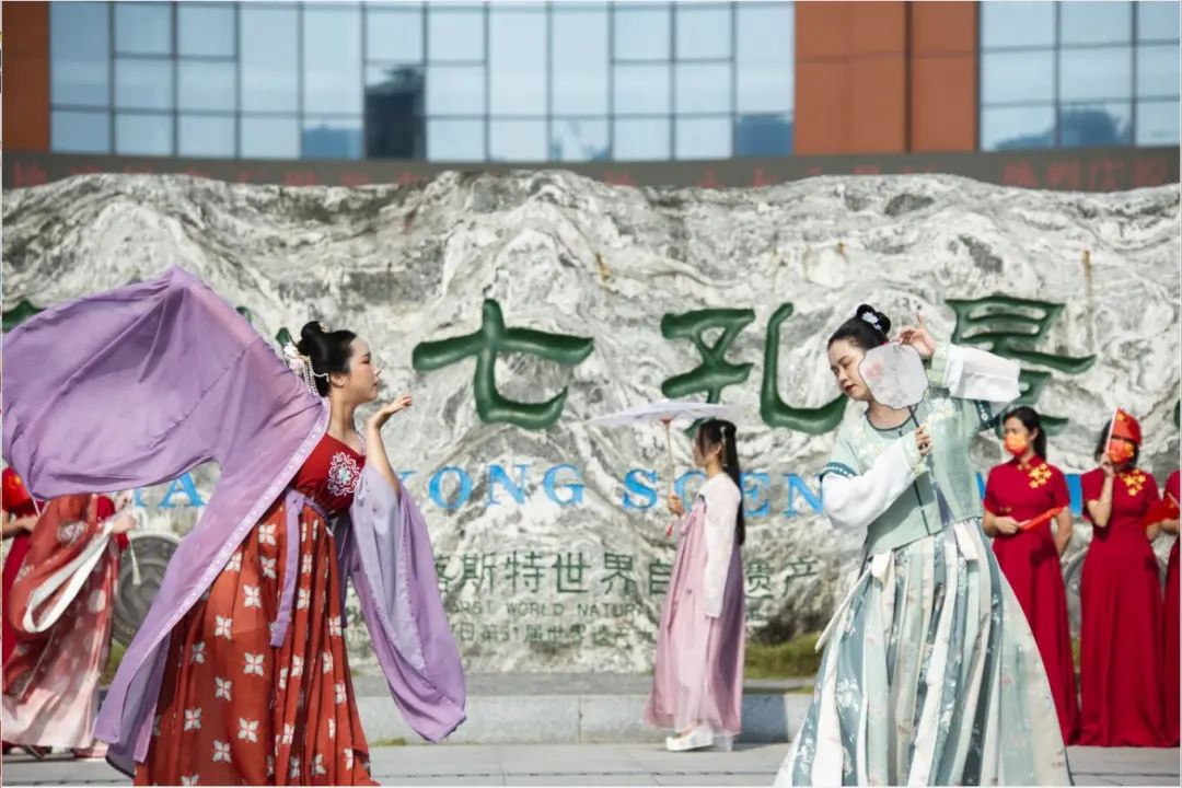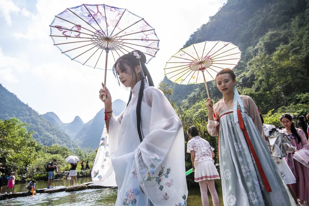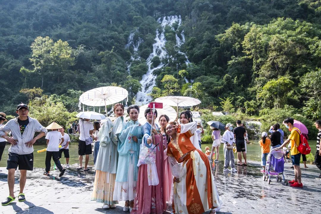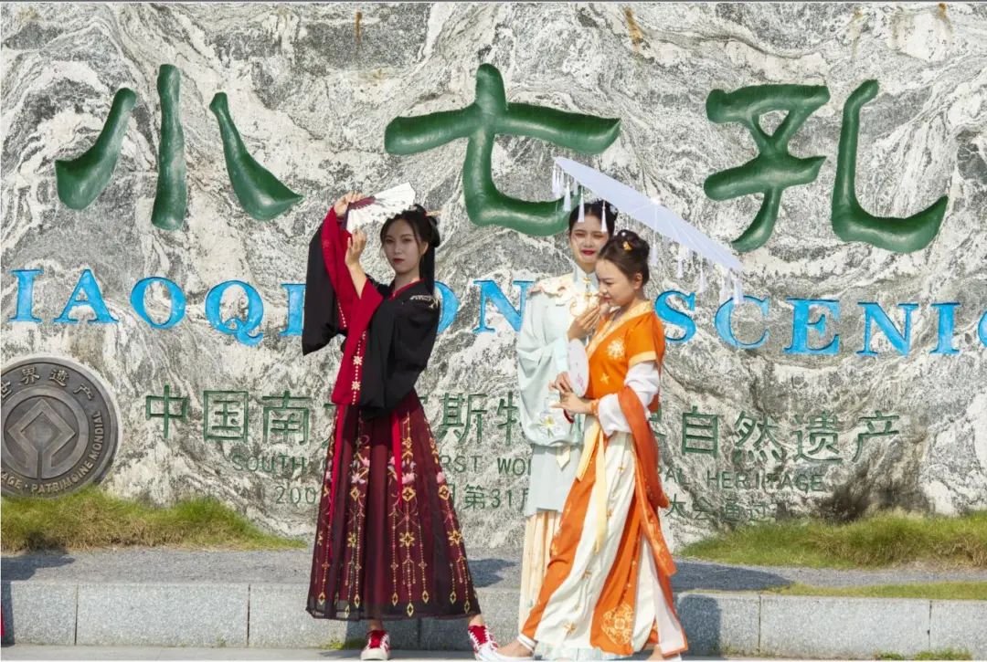 国庆假日第二天,小七孔景区迎来客流高峰,接待游客3万余人,各景点游客游览秩序良好,疫情防控严格有序,八方游客欢度国庆。 ![]() 正值祖国72周年华诞之际,小七孔景区开展“着中华传统服饰,游祖国大好河山”活动,以国风古装走秀形式,献上祖国72周年贺岁之礼,吸引众多传统服饰爱好者前来小七孔打卡。
