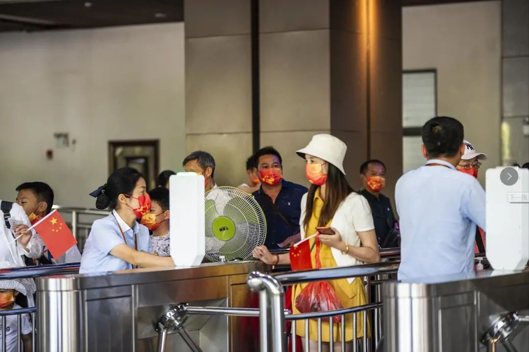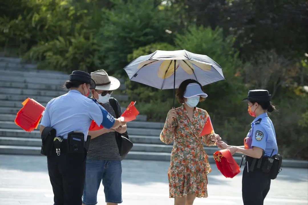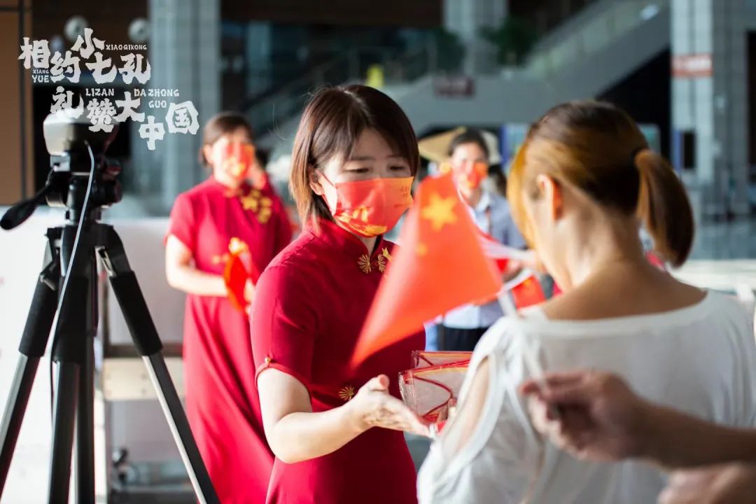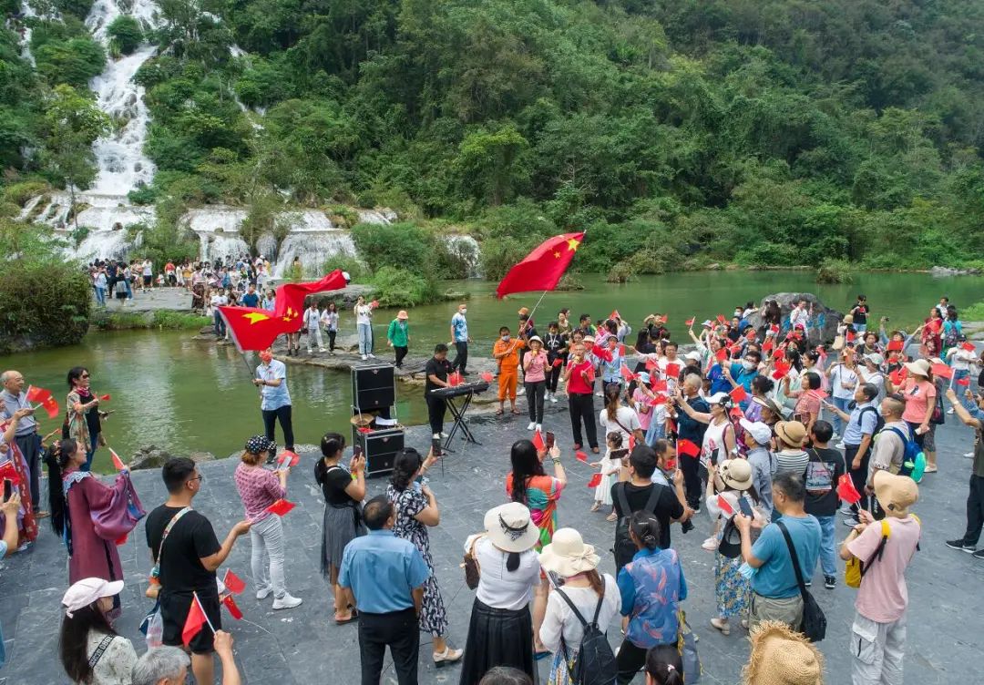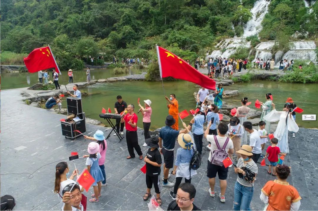 景区工作人员分发红色印记口罩及小国旗给过往游客,浓厚热烈的氛围和热情洋溢的演唱现场感染了在场游客,大家和着旋律纷纷挥舞手中的小国旗一同高歌,大小国旗相互辉映,形成一片浪潮起伏的红色海洋,现场气氛燃爆整个景区。
